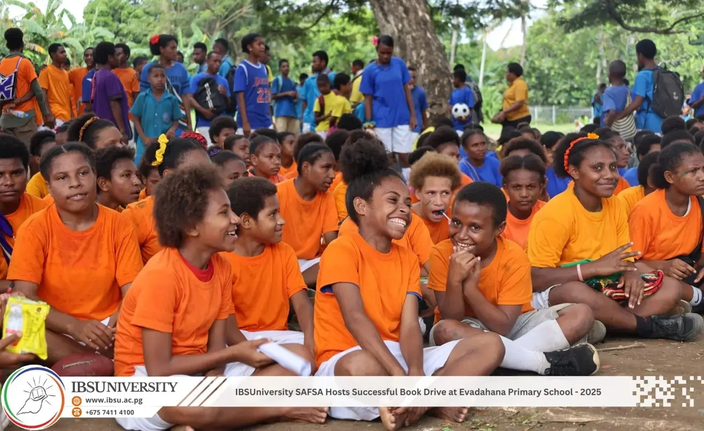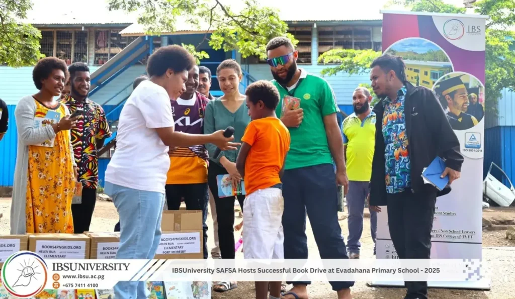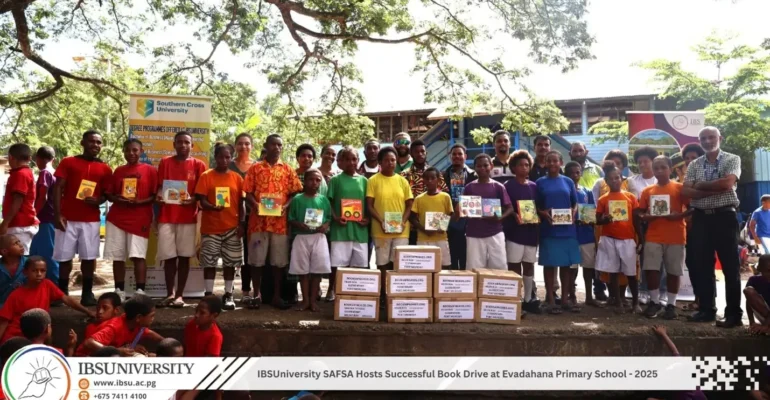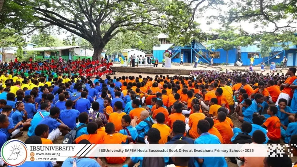 The inaugural book drive took place at Evedahana Primary School, located just 2 kilometers from IBSUniversity at 9 Mile, opposite the 9 Mile cemetery. As part of SAFSA’s ongoing mission, 496 books were generously donated to the school, benefiting over 2,000 students. The donation was made possible through a partnership with Books for PNG Kids, a charity based in Salisbury, Australia, and supported by the Department of Justice and Attorney General, Papua New Guinea.